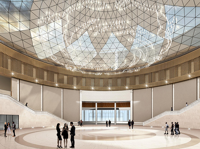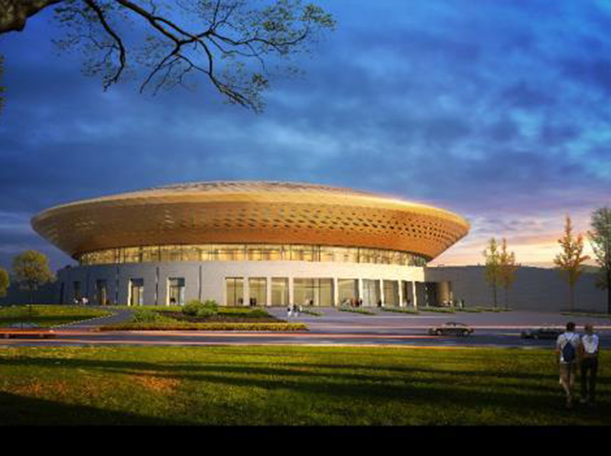 淮州新城國(guó)際會(huì)展中心采用圓形作為基本形體,通過(guò)透明玻璃幕墻從底部托起,營(yíng)造出建筑整體懸浮半空的姿態(tài),形似“UFO”飛行器。主要分為展覽中心、會(huì)議中心、航空博物館和設(shè)備用房及庫(kù)房等輔助功能區(qū)三部分功能分區(qū)。一層為展廳,服務(wù)于未來(lái)航空產(chǎn)業(yè)產(chǎn)品的展覽,二三層為會(huì)議功能區(qū),服務(wù)于大型航空產(chǎn)業(yè)會(huì)議的召開(kāi),四層為航天博物館。未來(lái),淮州新城國(guó)際會(huì)展中心將成為淮州新城通用航空產(chǎn)業(yè)對(duì)外展示的窗口。