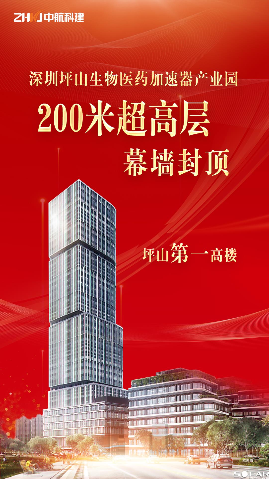 2024年1月31日,隨著深圳坪山生物醫藥加速器產業園12棟樓最後一塊幕墻單元體吊裝到指定位置,中航科建建設集團承接的200米超高層幕牆如約完成封頂,坪山第一個高樓“盛裝”亮相。